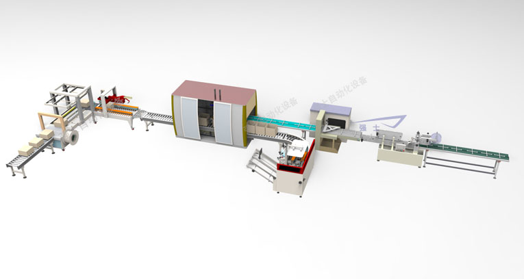 本生產線包含紙箱成型、自動裝箱、封箱、打包、機器人碼垛、自動托盤庫等設備。適合于各種